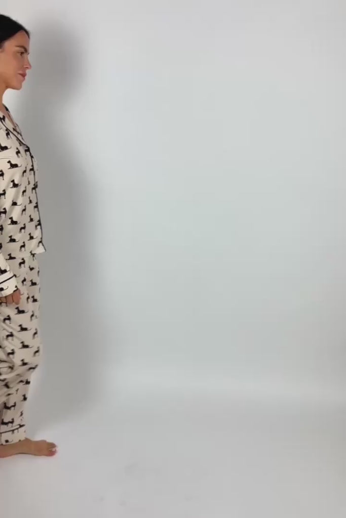 The Grace Long Pajama Set in our exclusive hand-drawn Great Dane print is a two-piece set featuring a classic button-down top with a relaxed fit, long sleeves, and a notch collar, finished with delicate ruffled piping. The matching long wide-leg pants include a soft elastic waistband and practical side pockets.