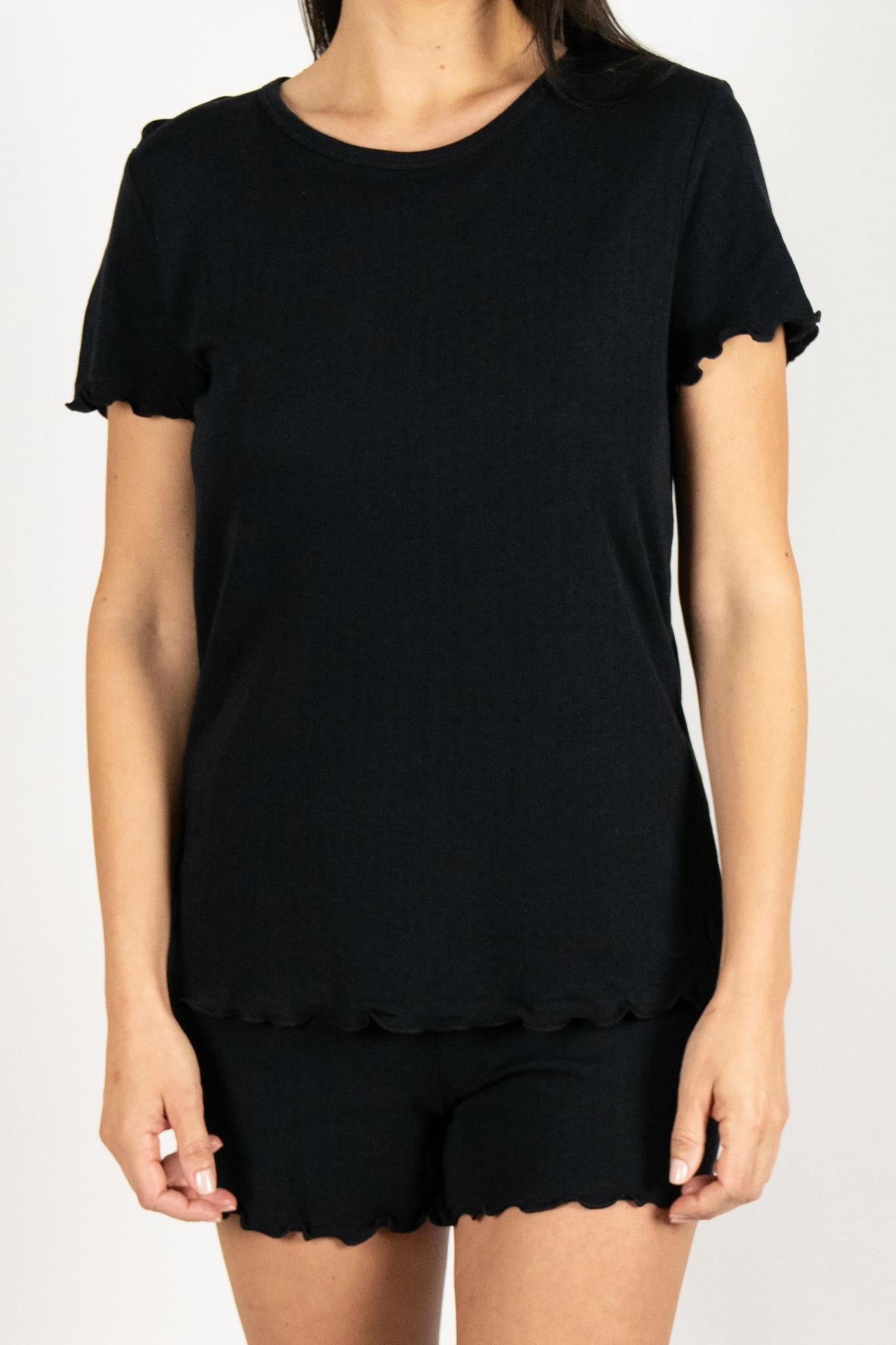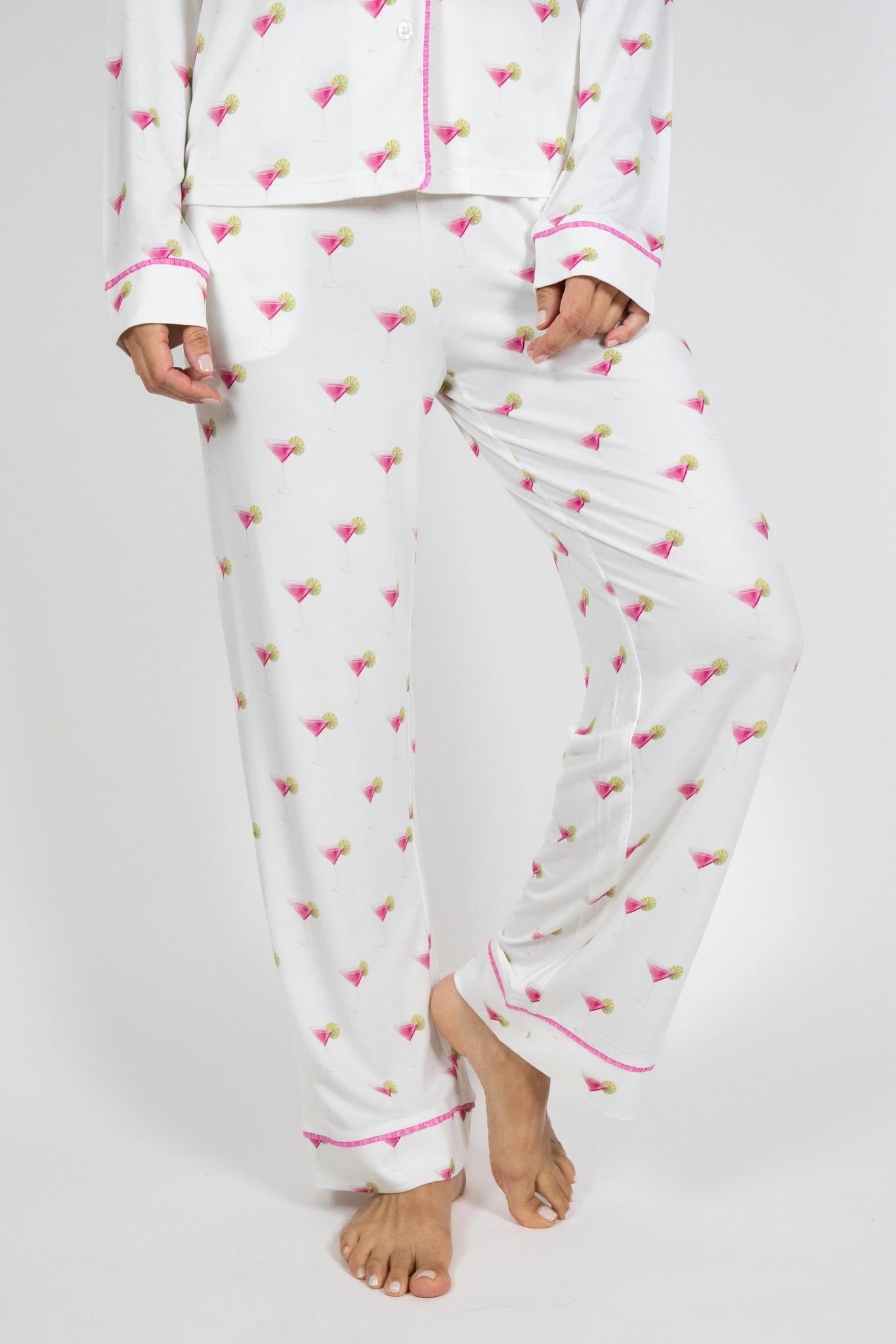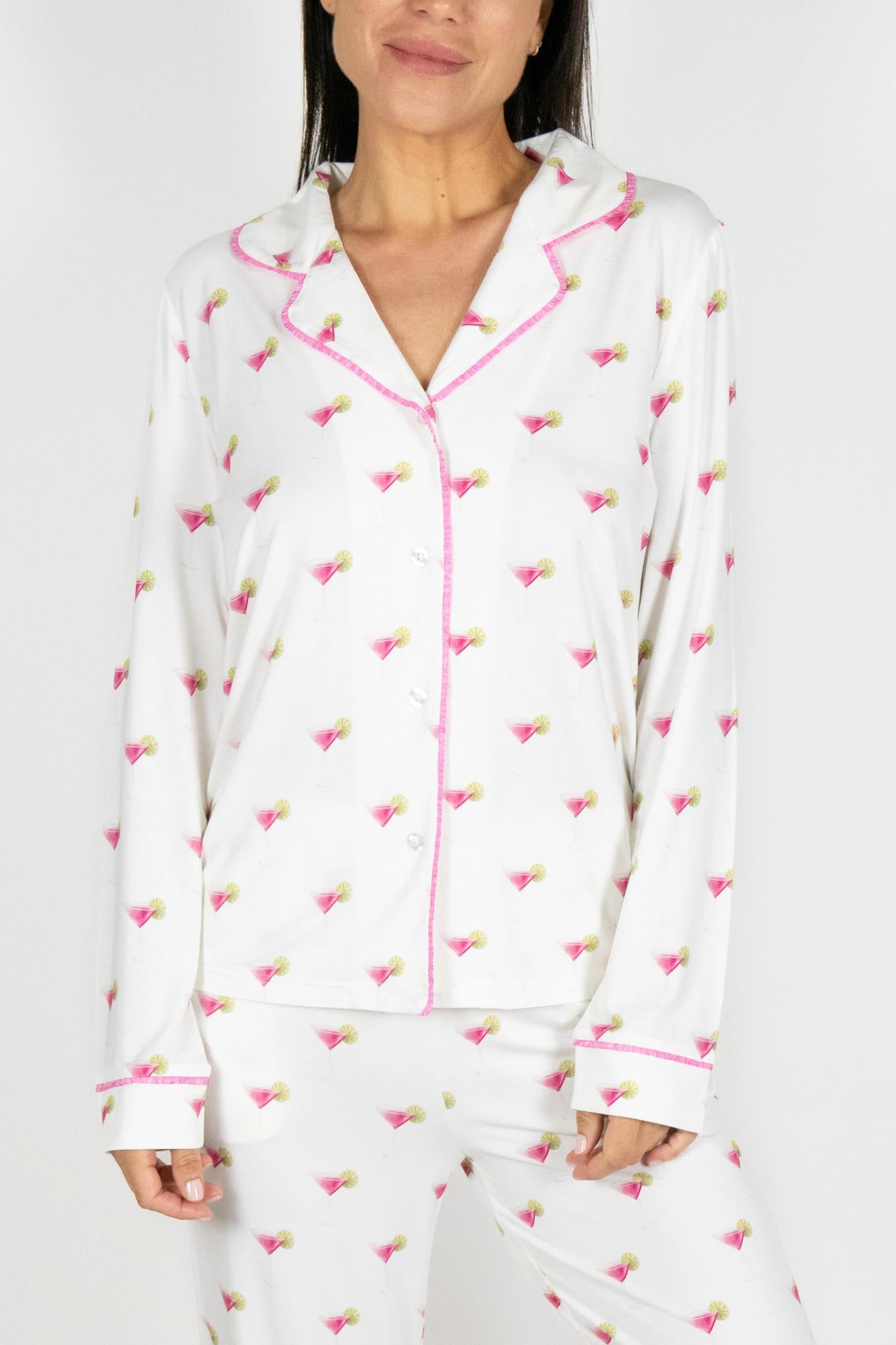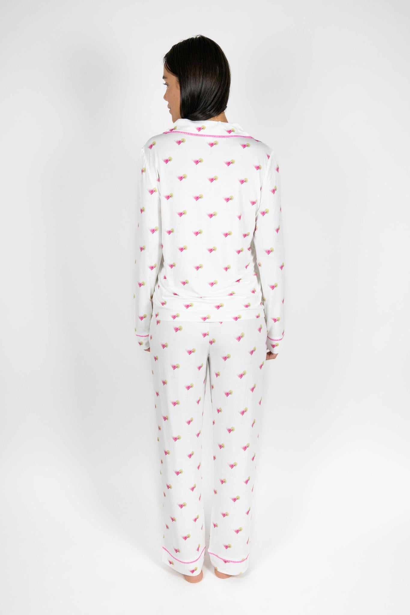 Jolene Long Pajama Set in Black accented with luxurious white piping and buttons, the set features gently flared, ankle-length pants for a slim, sophisticated silhouette. Made from breathable, lightweight natural fibers, it’s softer than cotton and moisture-absorbent for ultimate comfort.