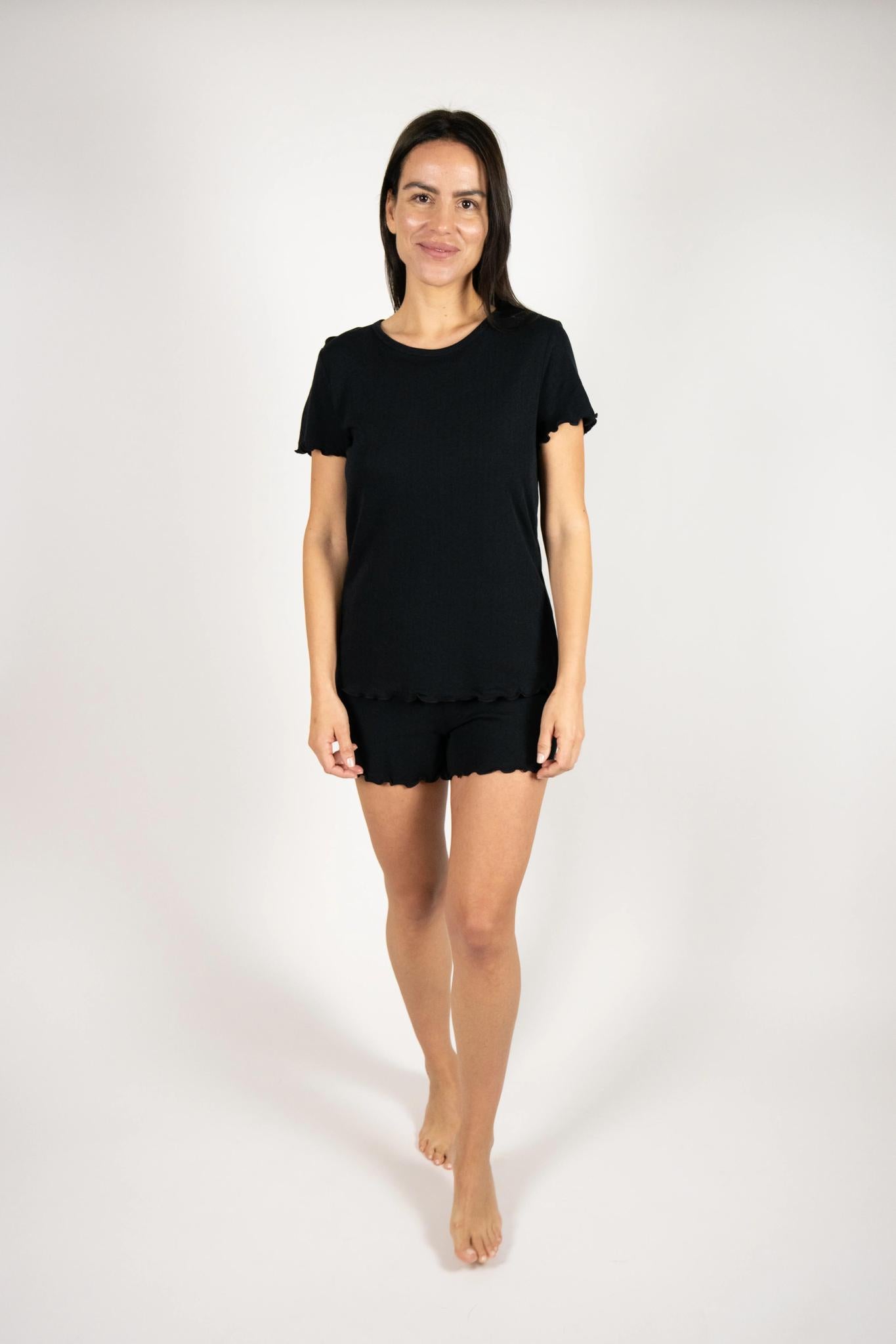 From our Ultra-Light Organic Bamboo Collection, the Jolene Long Pajama Set in Black exudes timeless elegance and unmatched comfort. Accentuated with luxurious white piping exclusively sourced from Japan, the set features gently tapered, ankle-length pants that create a gracefully slim silhouette, enhancing your natural shape with effortless sophistication.